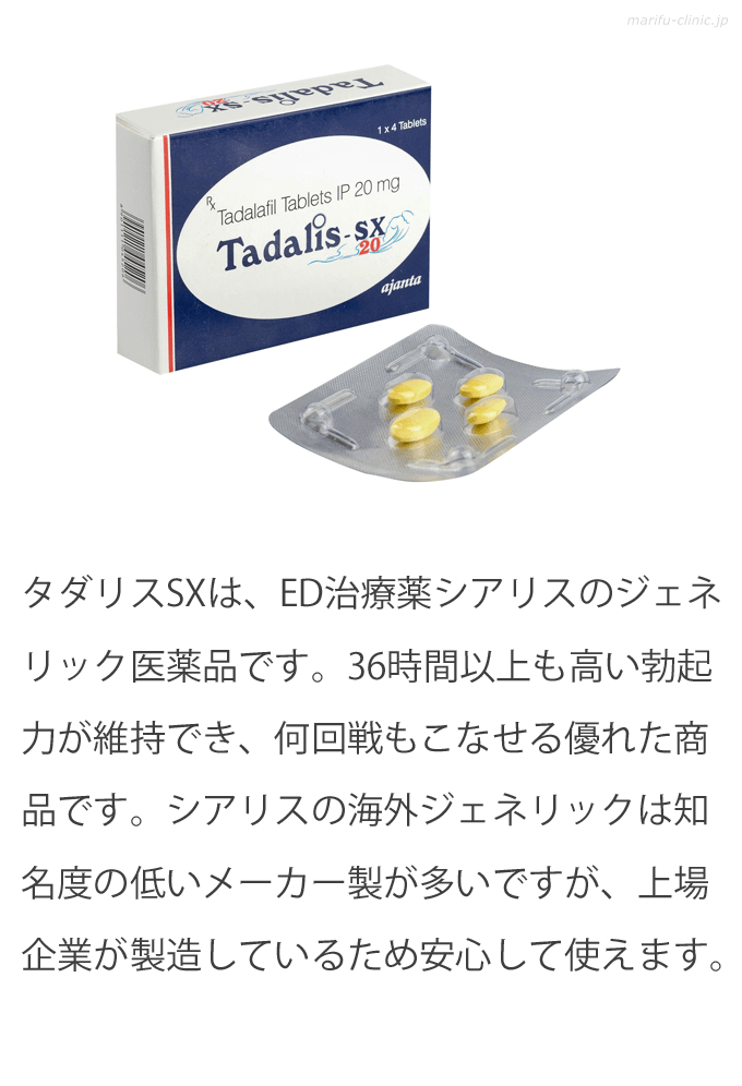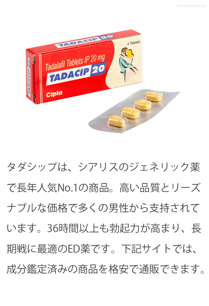 ただし、タダシップを服用しただけでは、勃起が自動的に起こるわけではありません。性的な興奮や刺激が加わることで、初めてその効果が現れます。性的刺激がなければ、勃起は起こりません。タダシップは性欲を高めるものではなく、勃起を助ける薬です。20mgのタダラフィルを含むタダシップは、シアリスのジェネリック医薬品で、勃起不全治療薬として広く知られています。シアリスと同様の成分を含み、性交渉時における陰茎の硬直や持続時間を向上させる効果が期待されます。市場には多くのシアリスのジェネリックが存在しますが、その中でもタダシップはその信頼性と効果において高い人気を誇ります。